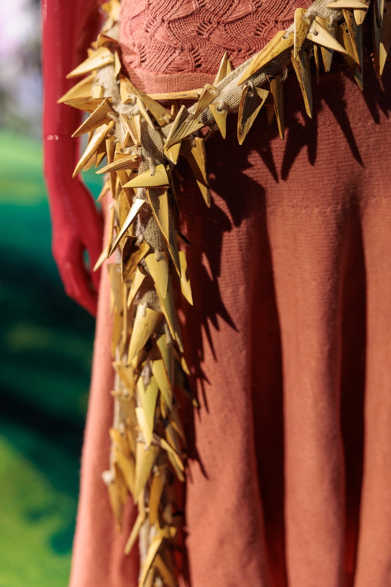 This look bring together Himalayan nettle sourced through a social enterprise in Nepal, regenerative marino wool from France, gathered through traditional transhumance practices, and dry branches from Southern Spain, handwoven using basketry techniques passed down through generations. This piece is finished with natural dyes made from Mexican tree bark. Each element telling a story of care, craft, and cultural continuity